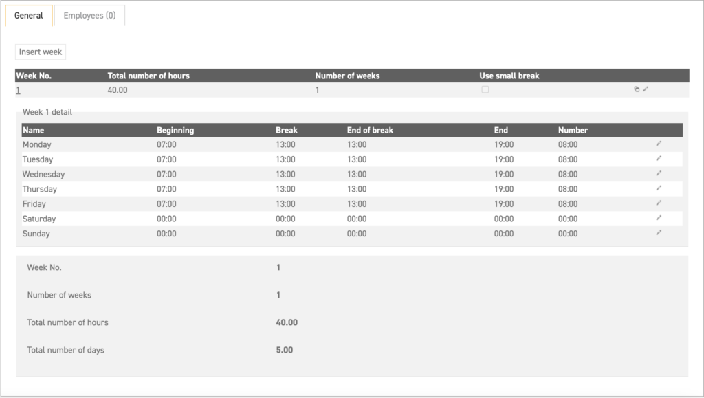 This schedule employs a break of 0 minutes. This does not entail that the employee will not be able to take a break, but serves to ensure that the number of hours deducted for taking a morning or afternoon off will be correct.